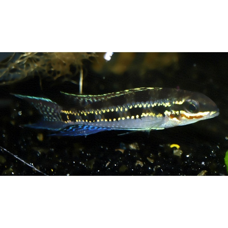 Informations sur le genre: Dicrossus filamentosus appartenait autrefois au genre Crenicara, mais partage désormais le genre Dicrossus avec Dicrossus maculatus. Les deux espèces se ressemblent, mais D. maculatus est dépourvu de la nageoire caudale en forme de lyre de D. filamentosus. Certains affirment cependant que D. maculatus présente une coloration corporelle encore plus remarquable que celle, déjà impressionnante, de D. filamentosa.